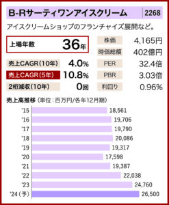 アイスクリームショップのフランチャイズ展開などを手掛けるB─Rサーティワンアイスクリーム(2268・S・東京都品川区)。有名キャラクターとのコラボ商品やアイスクリームのテイクアウト事業の拡大などを背景に、業績を伸ばしている。