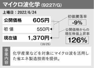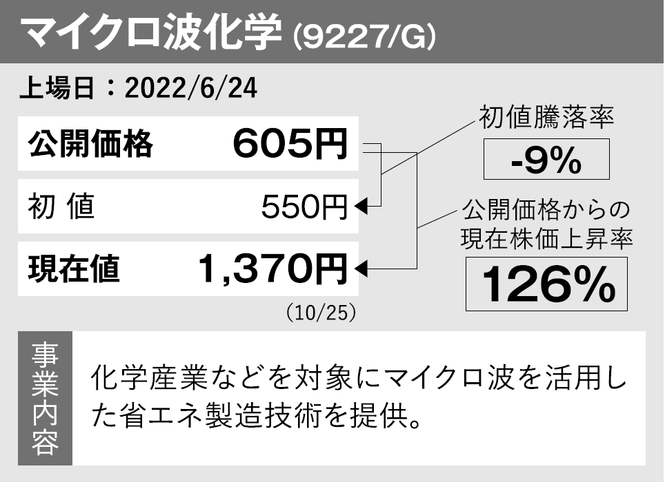 他にもINTLOOP(9556)、ジャパンワランティサポート(7386)なども、「小さく生まれて大きく育つ」期待企業にカウントできる。またパソナの連結対象子会社でテレマーケティングを展開するビーウィズ(9216)なども、そんな1社。だが期待の大きさという視点では、マイクロ波化学(9227)に注視している。「100年変わらなかった化学産業に マイクロ波技術でイノベーションを起こす」が社是。2022年6月24日、公開価格605円に対し初値550円で生まれた。公開直後の23年3月期は「41・2%増収、5900万円の営業黒字、最終黒字7500万円」。今3月期は「51・9%増収、32%営業減益、18・7%最終増益」予想。開発プロジェクト(研究投資)先行の今が、読み取れる。