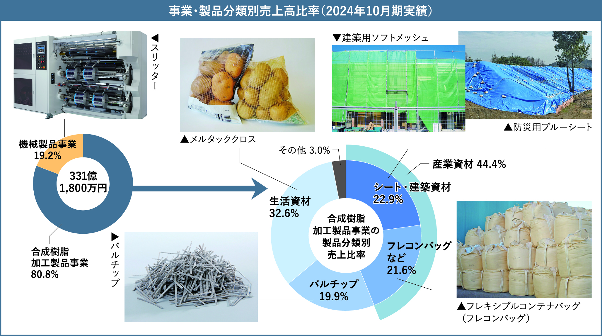 同事業の製品分類別の内訳は、シート、ラミクロス、土のうなどの建築資材及びフレコンバッグを含む「産業資材」が約44%。粘着テープ関連、人工芝用原糸・メルタックなどの「生活資材」が約33%。インフラ・建設・鉱山向けの「バルチップ」が約20%。