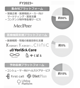 1つ目は、基盤事業であり売上の約80%を占める「集合知プラットフォーム」。MedPeerの運営を通じた製薬企業・医療機器メーカー向けのマーケティング支援を行う。2つ目は売上の約15%を占める「予防医療プラットフォーム」。クラウド型健康管理サービス「first call」、特定保健指導支援サービスなど、法人向け及び消費者向けのヘルスケアサービスを展開。そして3つ目が新たにセグメント化された「医療機関支援プラットフォーム」。かかりつけ薬局化支援サービス「kakari」をはじめ、在宅医療事務のアウトソーシングサービスを提供する「クラウドクリニック」、入退院支援サービス「YoriSoi Care」などを運営する。