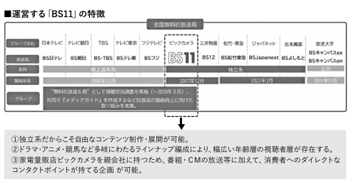 「BS11」では、ドラマ、アニメ、競馬中継、ショッピングの4ジャンルが収益に大きく貢献している。特徴は、曜日・時間帯毎に、ターゲット区分でゾーニングした番組編成だ。例えば、平日昼間はF3、F4(50歳以上の女性)層向けのドラマゾーン。土日昼間はM3、M4(50歳以上の男性)層向けの競馬ゾーン。夜11時〜深夜はTEEN〜M3(10代男女〜50代男性)層向けのアニメゾーンなど。