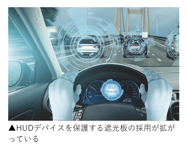 特に注目されるのが、高耐久を特徴とする染料系偏光板の新しい用途である車載HUD(ヘッドアップディスプレイ)遮光板だ。偏光機能を持つ遮光板は、HUDの表示輝度を下げることなく、HUD投影部に入射する直射日光のエネルギーを効率的にカットして、デバイスの熱劣化を著しく抑制できる。近年では、HUD表示領域の拡大にともない、日光の入射する開口部が大型化する傾向にあり、効率的に熱を遮断するHUD遮光板のニーズがますます高まっている。