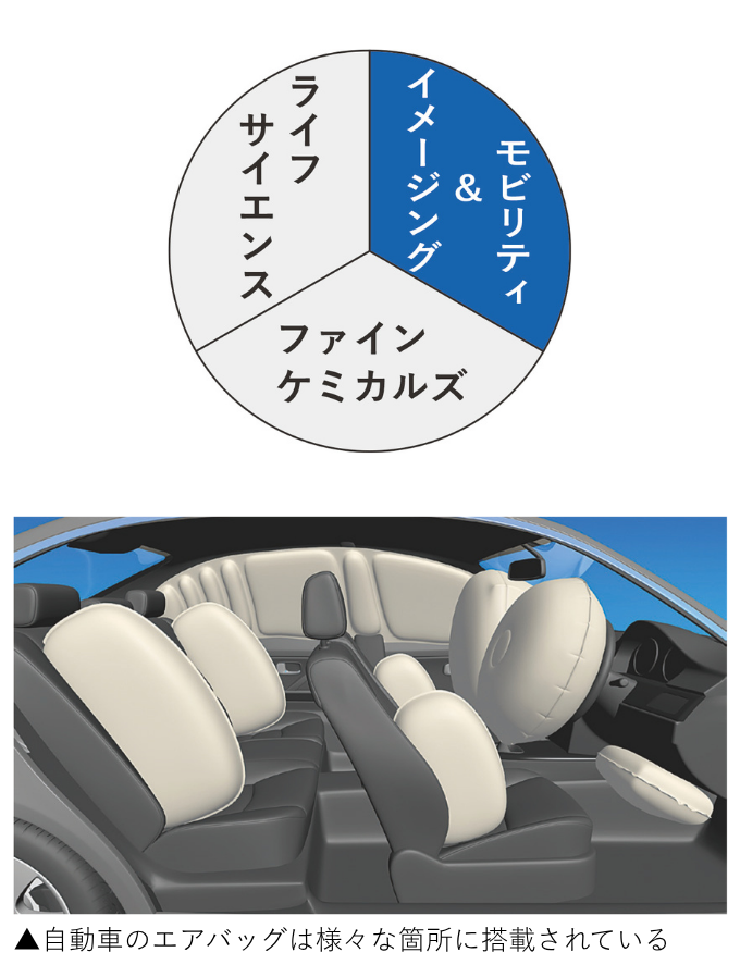 「モビリティ&イメージング事業」は、自動車分野の進化とともに拡大する“安全”と“視覚”に関わる素材ニーズに応える戦略的事業群だ。中でも、「セイフティシステムズ事業」と「ポラテクノ事業」は、同社が長年培ってきた火薬・化学・光学分野の技術を融合させた中核領域であり、それぞれが独自の強みでグローバル市場から高い信頼を獲得している。