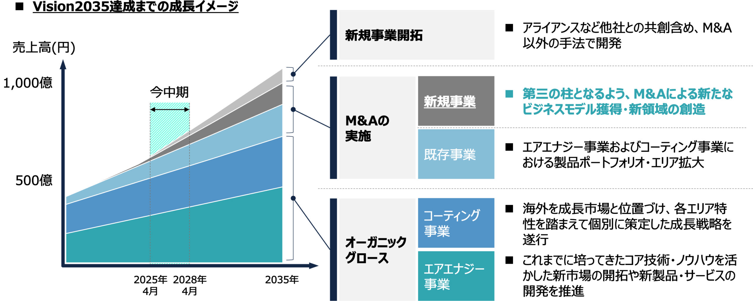 一方、事業領域の拡張を図るため、M&Aにも積極的に取り組む姿勢を明示した。技術・製品の補完や地域網の拡大を目的とした戦略的な投資により、既存の延長線上にとどまらない〝第三の軸〟の創出を目指す。すでに国内外において情報収集や候補検討が進んでおり、2027年度までに複数の成果が期待されている。