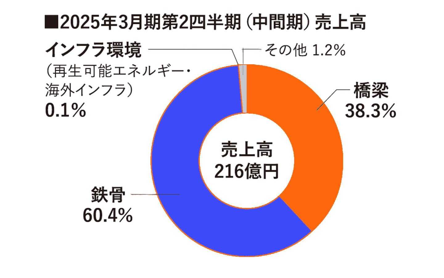 部門別の売上構成比では橋梁事業が38・3%、鉄骨事業が60・4%、インフラ環境事業が0・1%だった。