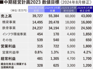 当初の中計では2026年3月期に売上高600億円、営業利益50億円、営業利益率8.3%を目標値に定めていました。当初は鋼橋の発注量が15~20万トン(※)で推移する見通しでしたが、想定を下回り昨年度は13万8000トンにまで下がりました。このまま推移したら10万トンを割り込むのではという懸念すら抱きます。このほか、鉄骨事業では高層ビルでの工事内容の見直しで延期や中止の案件があり下降する見込みです。これら外部環境による変化を受けて24年8月に売上高430億円、営業利益18億円、営業利益率を4.2%に修正しております。