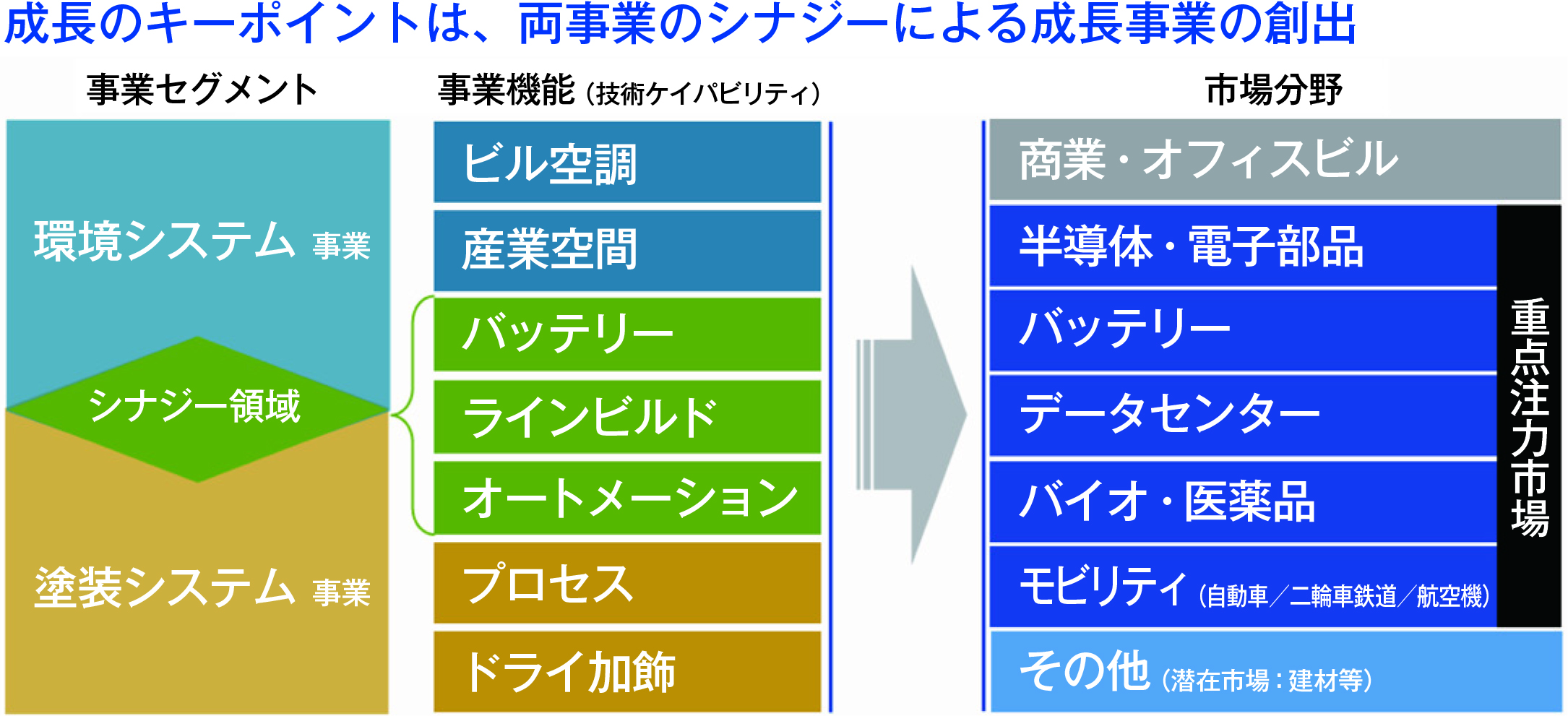 ポイントとなるのは、成長市場である半導体やEV(電気自動車)向けバッテリー工場への対応力強化。従来からの強みである空調や塗装のエンジニアリング技術を融合し、新たな受注機会を創出する。