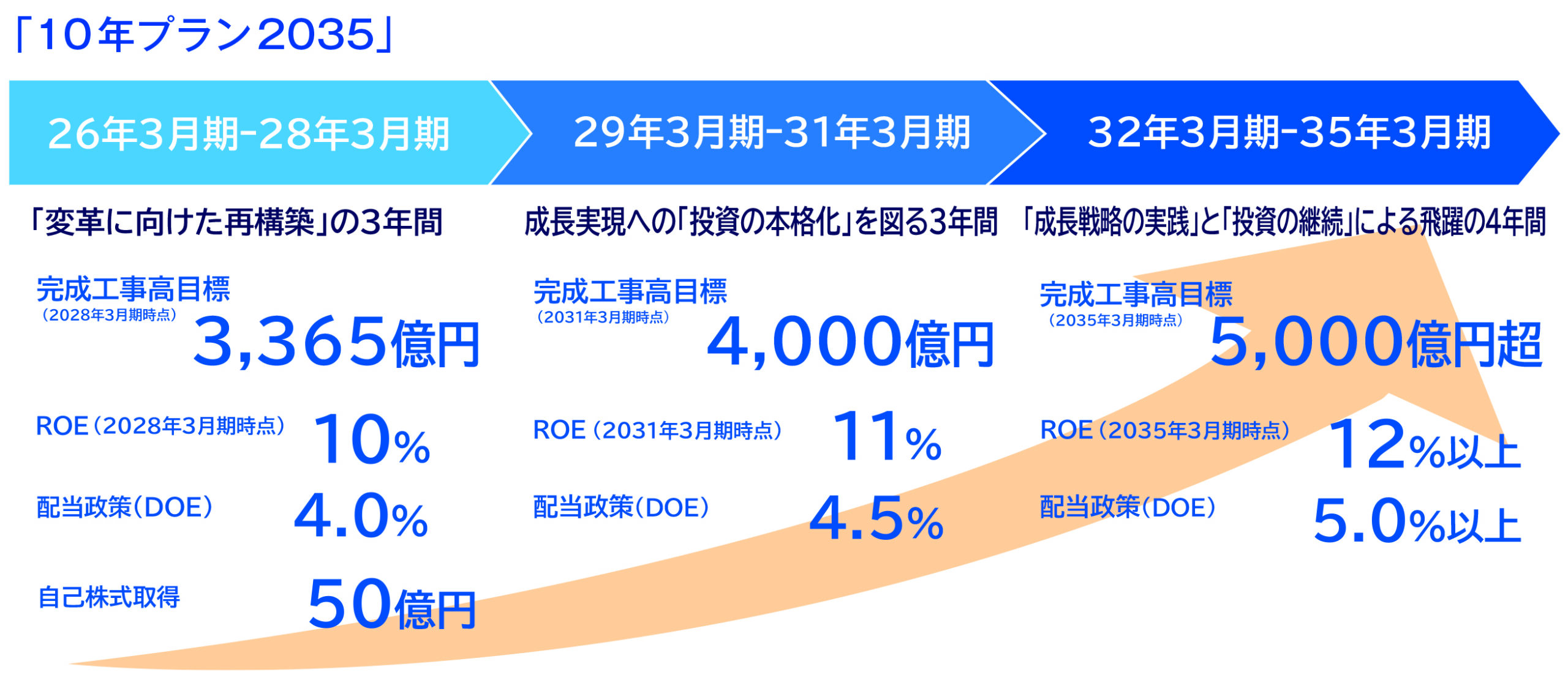 中期経営計画の財務目標では、ROE(自己資本利益率)10%、DOE(自己資本配当率)4%を設定し、10年プラン2035においては段階的な引き上げを計画。利益成長と株主還元の両立を目指しており、配当は安定配当を基本としつつ、必要に応じて自己株式の取得も検討する方針で、中期経営計画では年間50億円、3年間で150億円実施を予定しており、高い総還元性向を目指す。