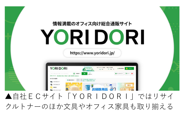 トナー市場において、リユーストナーの出荷量は約25%を占め、そのうち同社のシェアは約7~8%。製品は営業による販売のほか、運営するオフィス向けECサイト「YORIDORI」でメイン商材として扱っている。