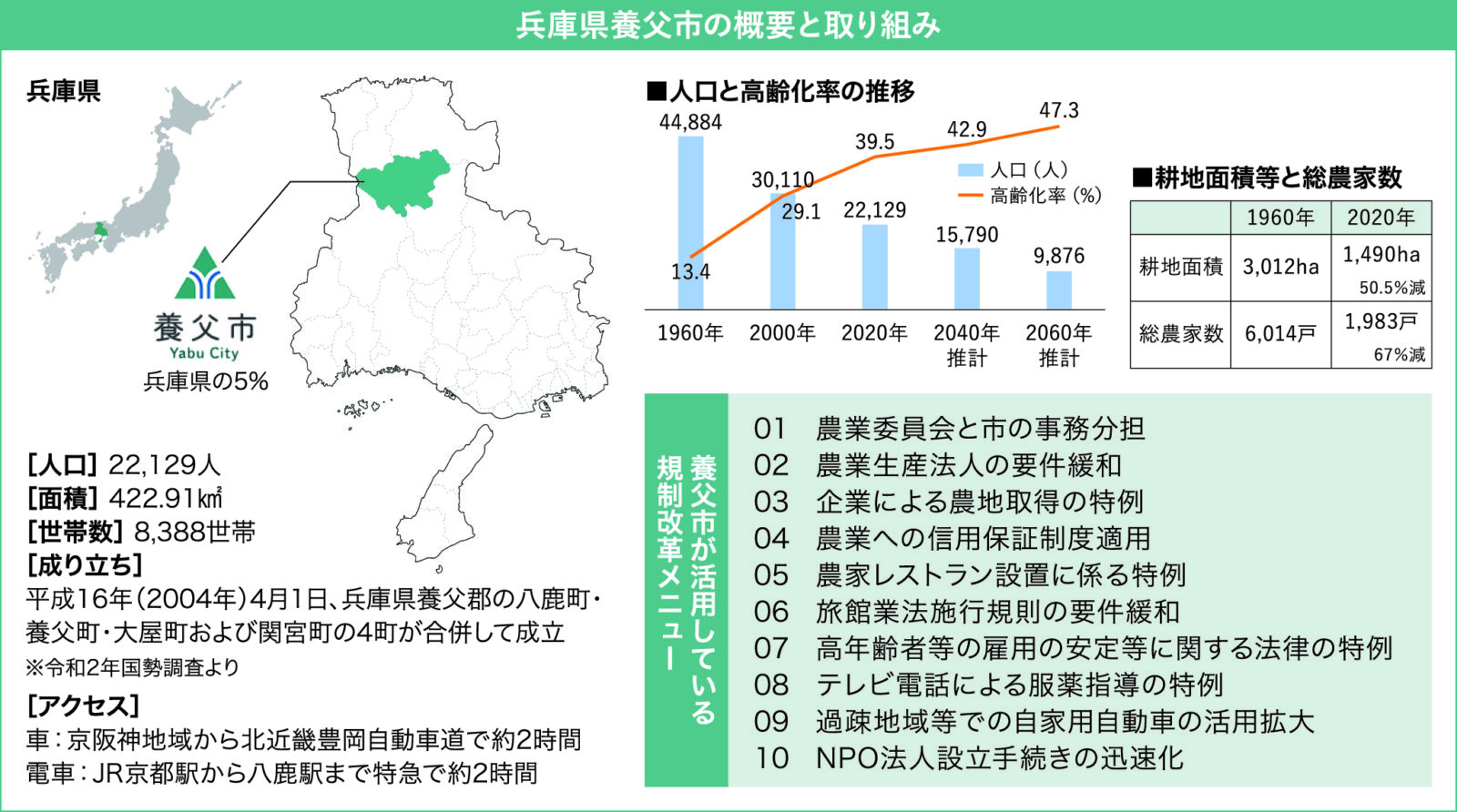 ─養父市は、人口約2万2000人、面積が兵庫県の約5%を占める422㎢で、その84%を山林が占める中山間地域ですね。2014年に国家戦略特区に指定されていますが、特区とはどういったものなのか、指定までの経緯や、これまでの取り組みについても教えてください。