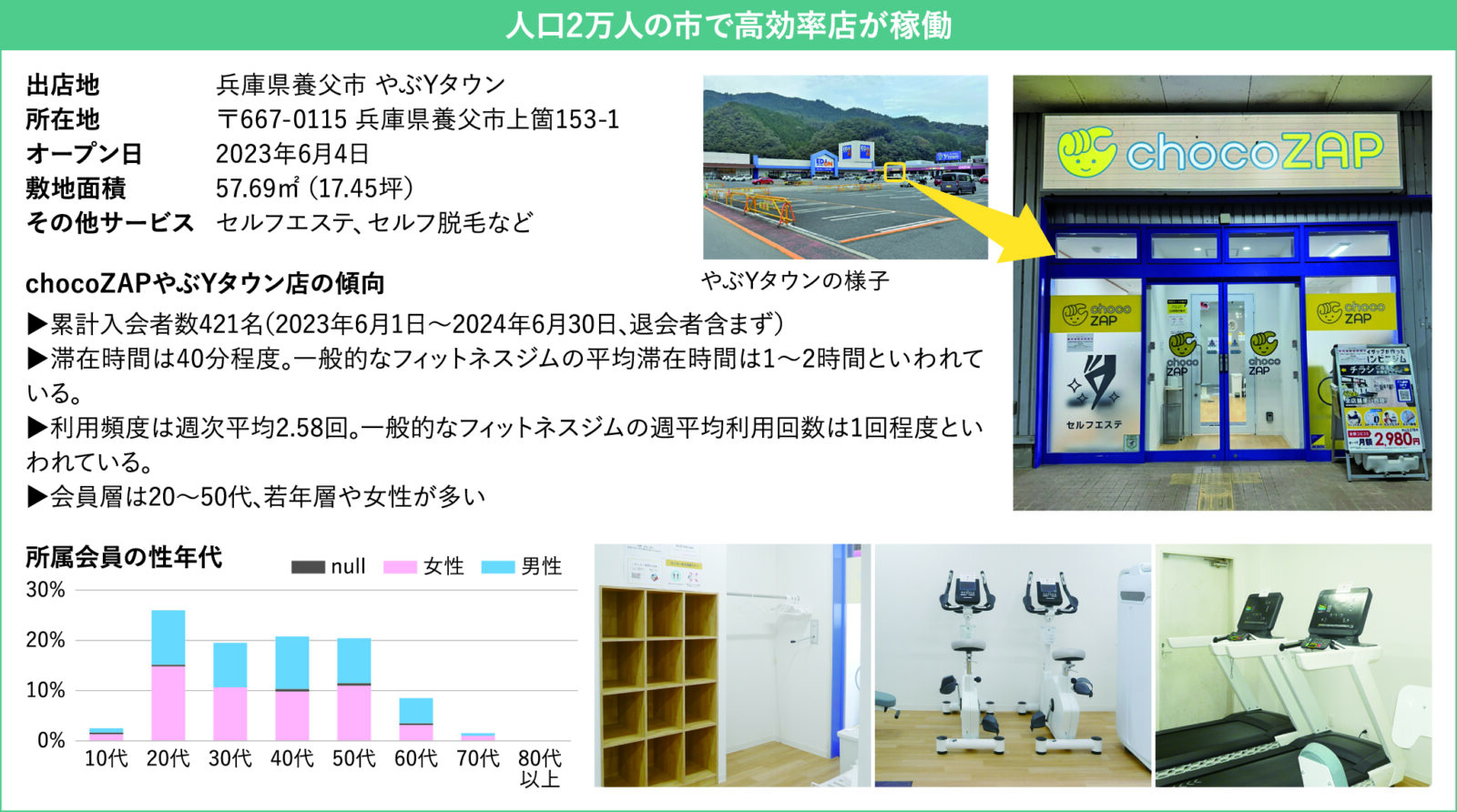 当社では、養父市の健康課題でもある青壮年期の肥満者割合の増加に対し、19年から3年間トレーナーを派遣し、市民のメタボ改善に向けたプログラムを提供しました。成果を評価していただき、23年5月には若年層から壮年期を中心とする幅広い年齢層の運動実施率向上と習慣化への取り組み推進に向けた包括連携協定を締結し、その一環として同年6月に養父市のショッピングの中心地であるやぶYタウンに「官民連携コンビニジム」1号店としてchocoZAPを開設しました。同店舗はオープン1年経過後も全国屈指の坪効率を誇っており、400名以上の方に継続的にご利用いただいております。
