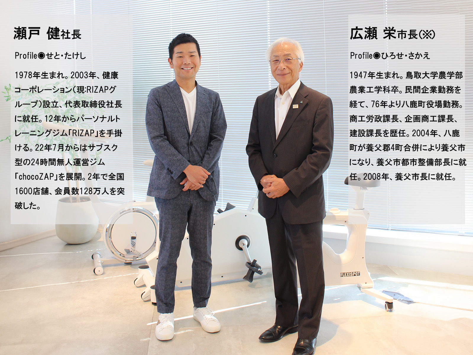 瀬戸 chocoZAPはDXを活用した無人運営のローコスト健康増進施設ですので、財務面で課題を抱える地方自治体や人口減少が進む地域においても「持続可能な健康インフラ」として役割を果たすと考えています。広瀬市長のお話を聞く中で、養父市と当社には共通の考え方があると感じました。「持っている強みやアセットを有効活用し、初期投資やランニングコストをできるだけ最小化しながら、そこから生み出される効果や生産性を最大化していく」という考え方です。養父市で言えば、耕作放棄地への農業法人参入や、元気なシルバー人材にご活躍いただくための取り組み、廃校した校舎の活用、ライドシェアなどが挙げられますよね。当社で言えば、地方における空き物件や公共物件の余剰スペースの活用や、コンビニジムの特徴である持続可能な運営体制です。スタッフ常駐施設は人件費が高額になりますので、地方では人口や税収の問題からなかなかランニングコストが賄えませんが、無人運営であればサステナブルな運営が可能です。chocoZAPでは、市民の方々の運動習慣定着、シニアの方々のご活躍と元気リーダー(※1)としての雇用創出、ライフログデータを活用した医療介護DX の実現、健康格差や地方格差の是正に取り組んでいます。