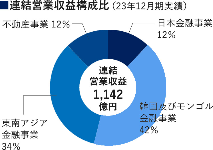 Jトラストは窮地に陥った国内外の金融機関をM&Aで買収し、再生させることで成長を遂げてきた。2012年に韓国で破綻した貯蓄銀行を買収し、わずか2年半で通期黒字化へ導いたことを皮切りに、シンガポール、インドネシア、モンゴル、カンボジアの金融市場に参入。現在はアジア圏に展開する総合金融グループとなり、23年12月期における連結営業収益構成比は、日本金融事業12%、韓国及びモンゴル金融事業42%、東南アジア金融事業34%、不動産事業12%となった。
