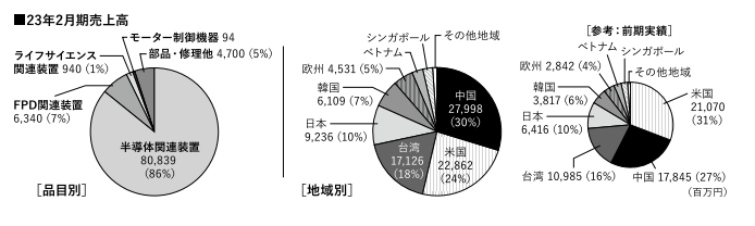 国別の売上比率では中国がアメリカを超えて30%とトップになり、次いでアメリカ24%、台湾18%、韓国7%、日本は10%、海外比率は9割にも上る。半導体需要の高まり、円安の影響に加え、22年9月からはベトナムで8番目となる新工場の稼働をスタートし、搬送ロボなどの生産能力が倍増して需要を取り込めたことも好調の要因となっている。特に中国向けは前期比62%増、台湾向けは同47%増と大きく伸びている。
