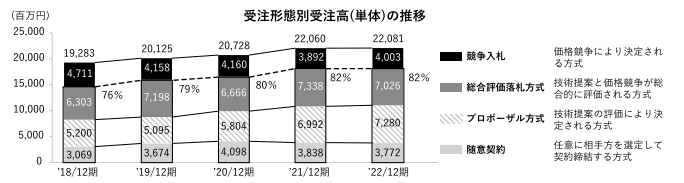 同社は付加価値の高い業務の受注に注力。技術力・提案力で評価される総合評価落札方式、プロポーザル方式、随意契約での受注額が全体の8割以上を占める。