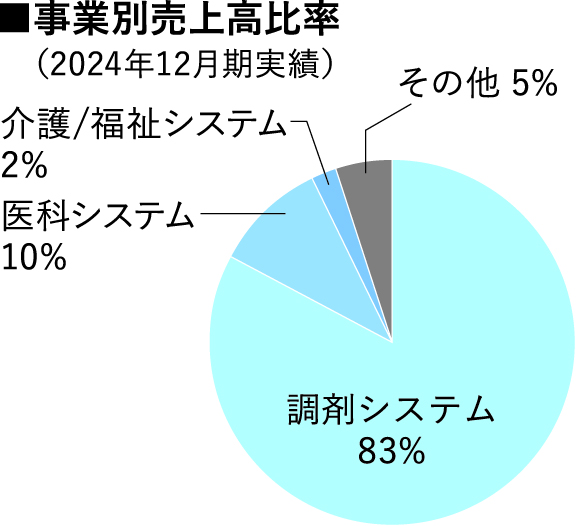 主な事業セグメントは、処方箋を扱う薬局向けの「調剤システム事業」、入院設備を持たない無床クリニックに電子カルテシステムなどを提供する「医科システム事業」、そして介護/福祉施設向けにオンラインでの介護記録や請求業務のシステムを提供する「介護/福祉システム事業」の3つ。売上比率はそれぞれ83%、10%、2%。薬局向けシステムは、全国の薬局5万5000件の約45%のシェアを獲得し、業界首位だ。
