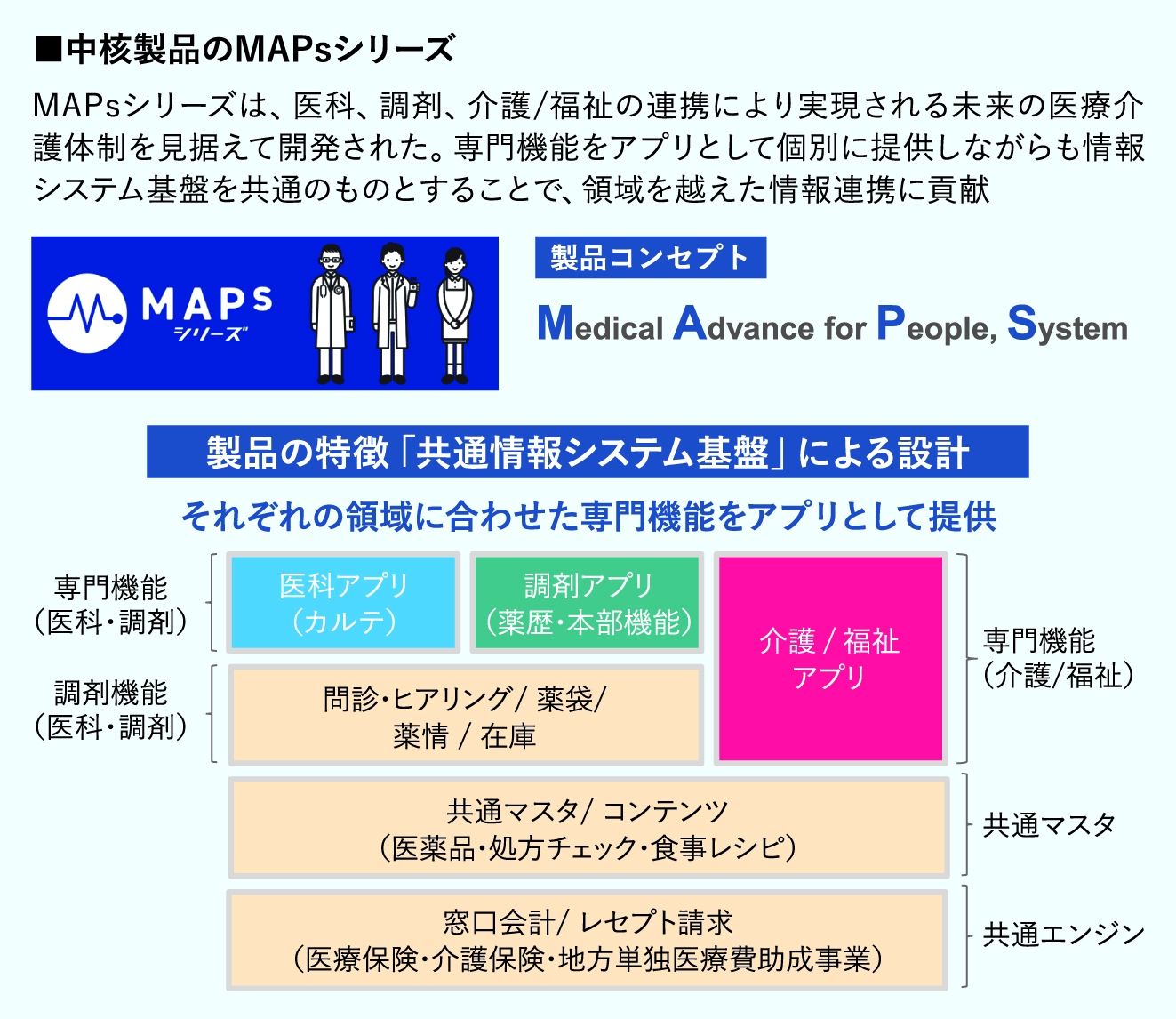 特に同社が中核製品として注力しているのが、3領域で共通のエンジン・マスタを基盤としたクラウド型システム「MAPs」シリーズだ。
