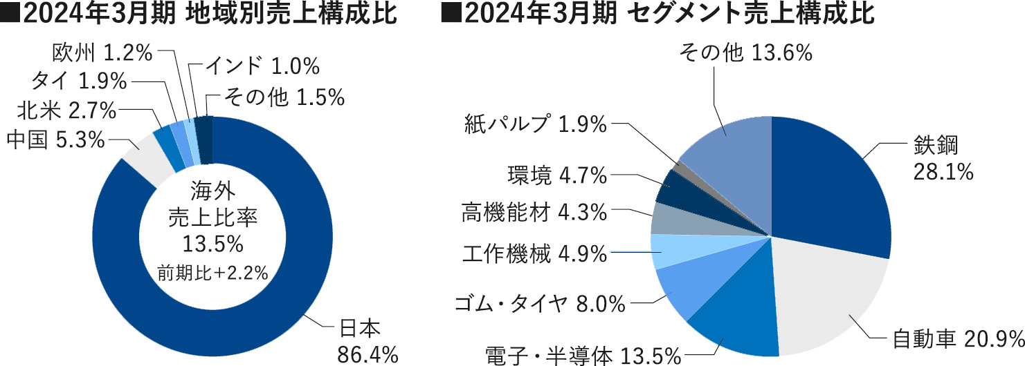 さまざまな製造業の生産現場に提供しているのは、流体応用機器や精密自動・計測機器、製鋼副資材などの生産財だ。2024年3月期における産業別の売上内訳は、鉄鋼が28・1%、自動車が同20・9%、電子・半導体が同13・5%と、3事業が大部分を占める。顧客の最終製品に使われるものではなく、生産・製造設備に関わる製品・副資材に絞って幅広い業界に対応している独特のビジネスモデルだ。