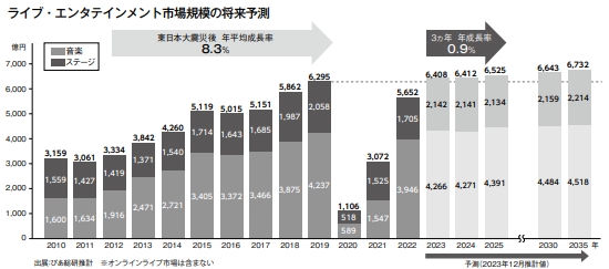 2023年のライブ・エンタテイメント市場規模は、これまで抑制されてきたエンタメ活動への反動消費に加え、興行規模の拡大、チケット単価の上昇等により、明らかに復調しており、2019年を超える見込みだ。しかし、長期的には、高齢化と人口減少を踏まえた対策が必要だ。