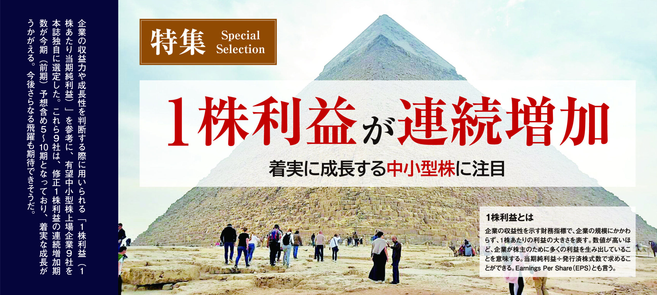 企業の収益力や成長性を判断する際に用いられる「1株利益(1株あたり当期純利益)」を参考に、有望中小型株上場企業9社を本誌独自に選定した。これら9社は、修正1株利益の連続増加期数が今期(前期)予想含め5~10期となっており、着実な成長がうかがえる。今後さらなる飛躍も期待できそうだ。