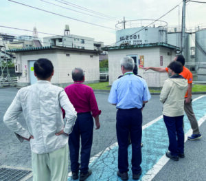 当日は参加者14名が2班に分かれ、敷地内にある製造工程やアルコール受入場などを見学した。製造ラインでは、グループ製品の充填やラベル貼付工程、箱詰め工程などをめぐり、ガイド役の同社社員がその都度丁寧に説明し、参加者は熱心に聞き入っていた。